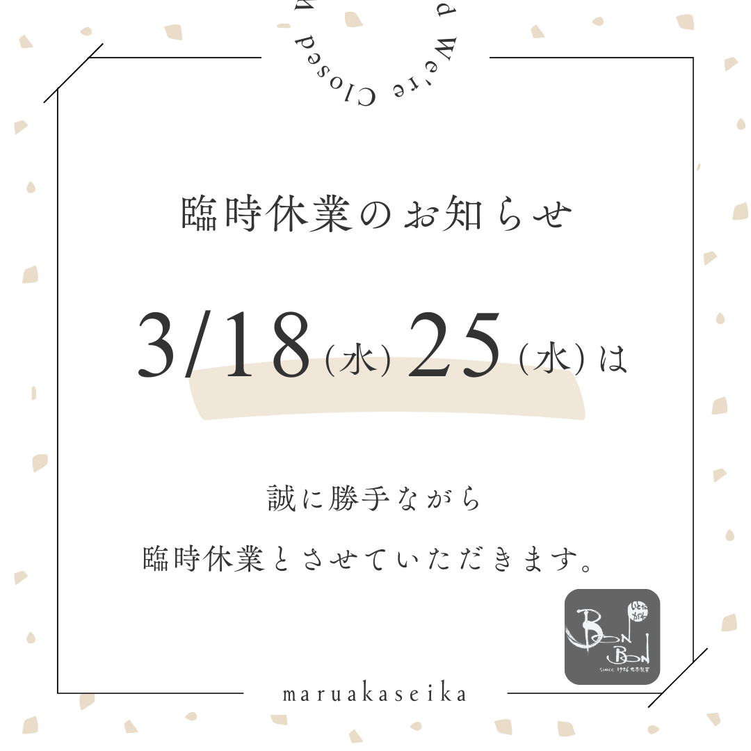 臨時休業のお知らせ 3/18/25誠に勝手ながらお休みさせて頂きます 投稿日 2026年3月16日 著者 maruaka カテゴリー お知らせ 誠に勝手ながら2月18日25日水曜日は臨時休業とさせていただきます どうぞよろしくお願いいたします ツイート