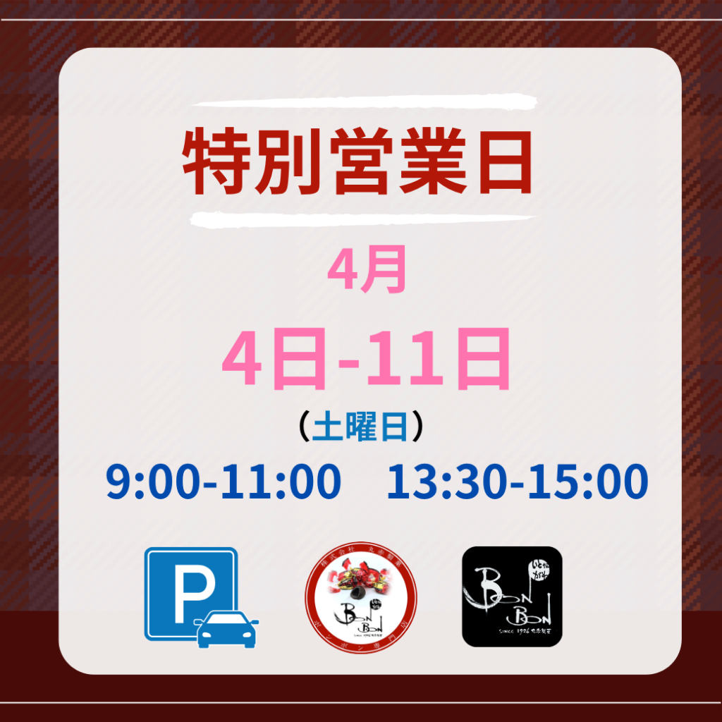 4月の特別営業のご案内📢4日⁻11日 投稿日 2026年3月30日 著者 maruaka カテゴリー お知らせ 特別営業のご案内🈺📢4月4日と11日 土曜 9時00分から11時 13時30分から15時 営業時間が普段と異なりますのでご注意ください⚠️弊社駐車場もございますので、ご利用くださいませ。特別営業 🉐訳ありB品各種 50円引きしてます💡 お時間合いましたら是非お越しをお待ちしております♪ 丸赤製菓 ツイート